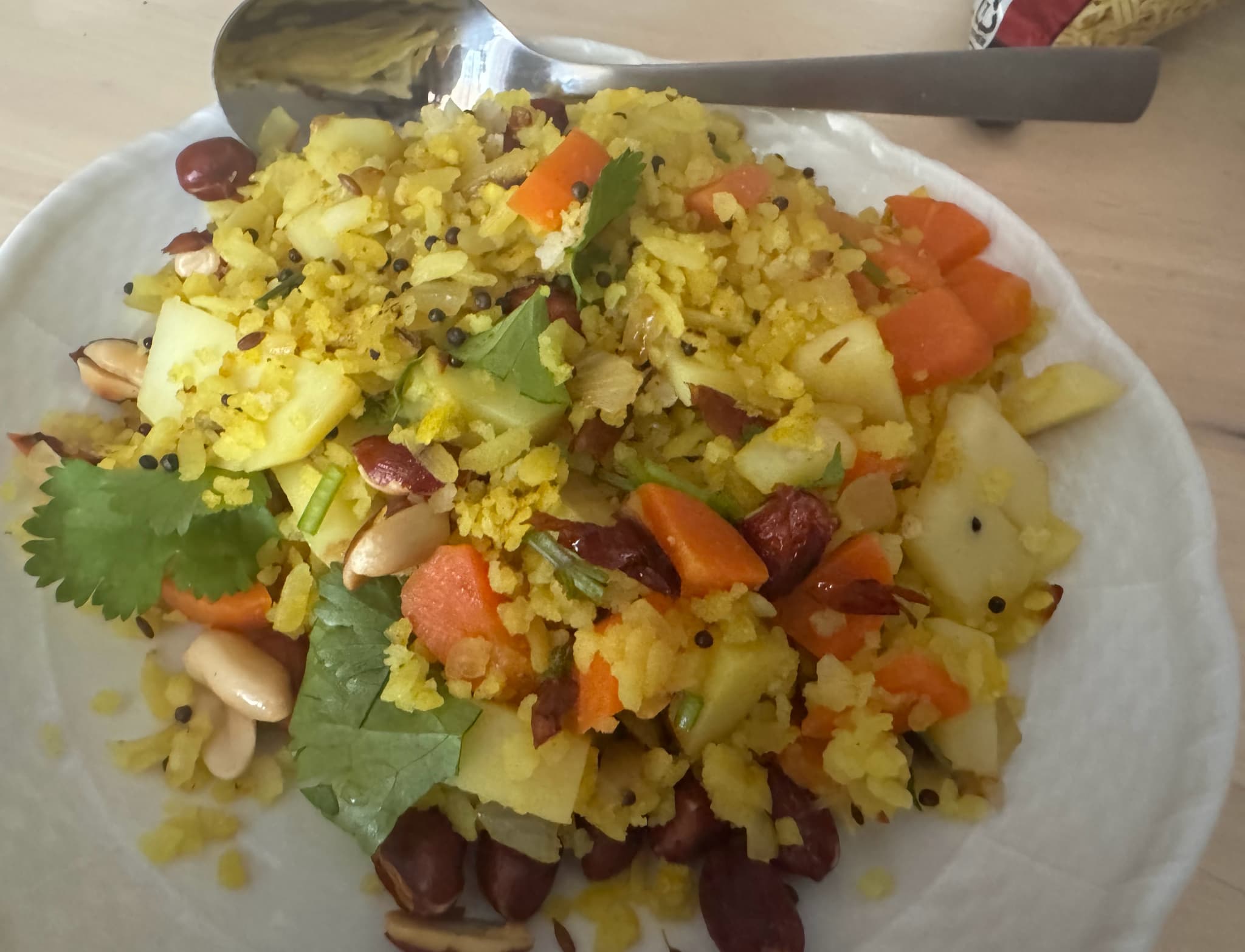 An Indian plate with flattened rice, spices, vegetables, and peanuts.