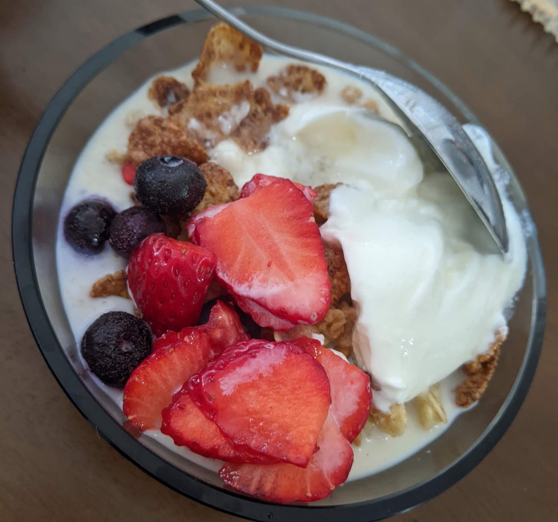A mix of oats, nuts, and dried fruits, served with yogurt or milk.